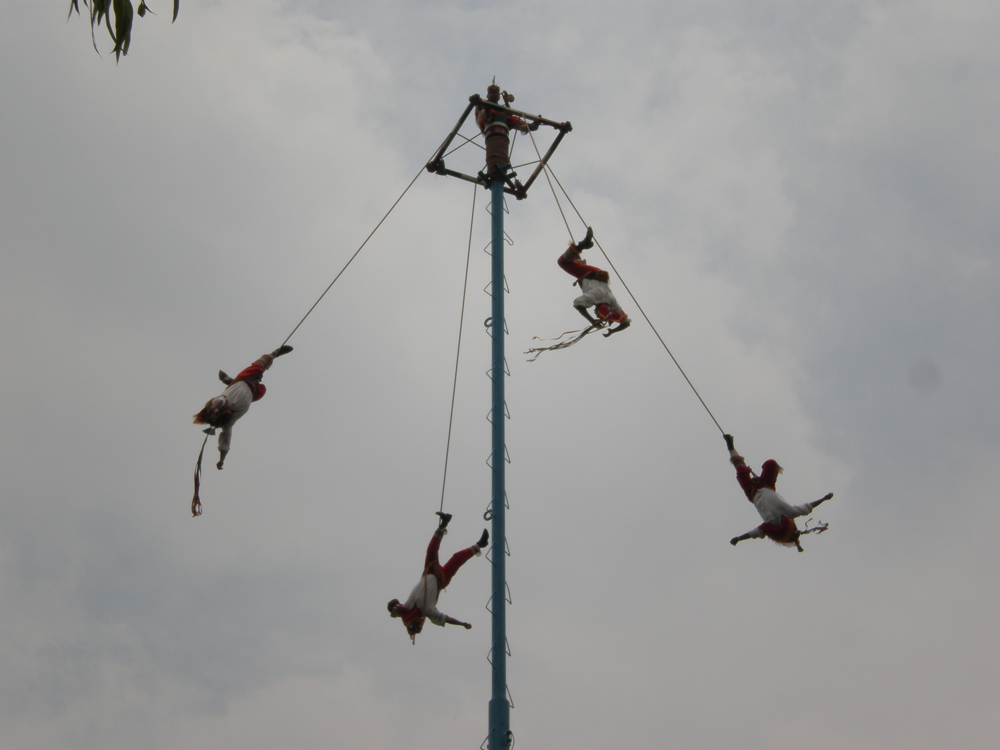 This is an ancient ritual of the Totonac that combines the 5 directions (north, south, east, west, center) and the calendar (4 men make 13 spirals down = 52 weeks of the year).