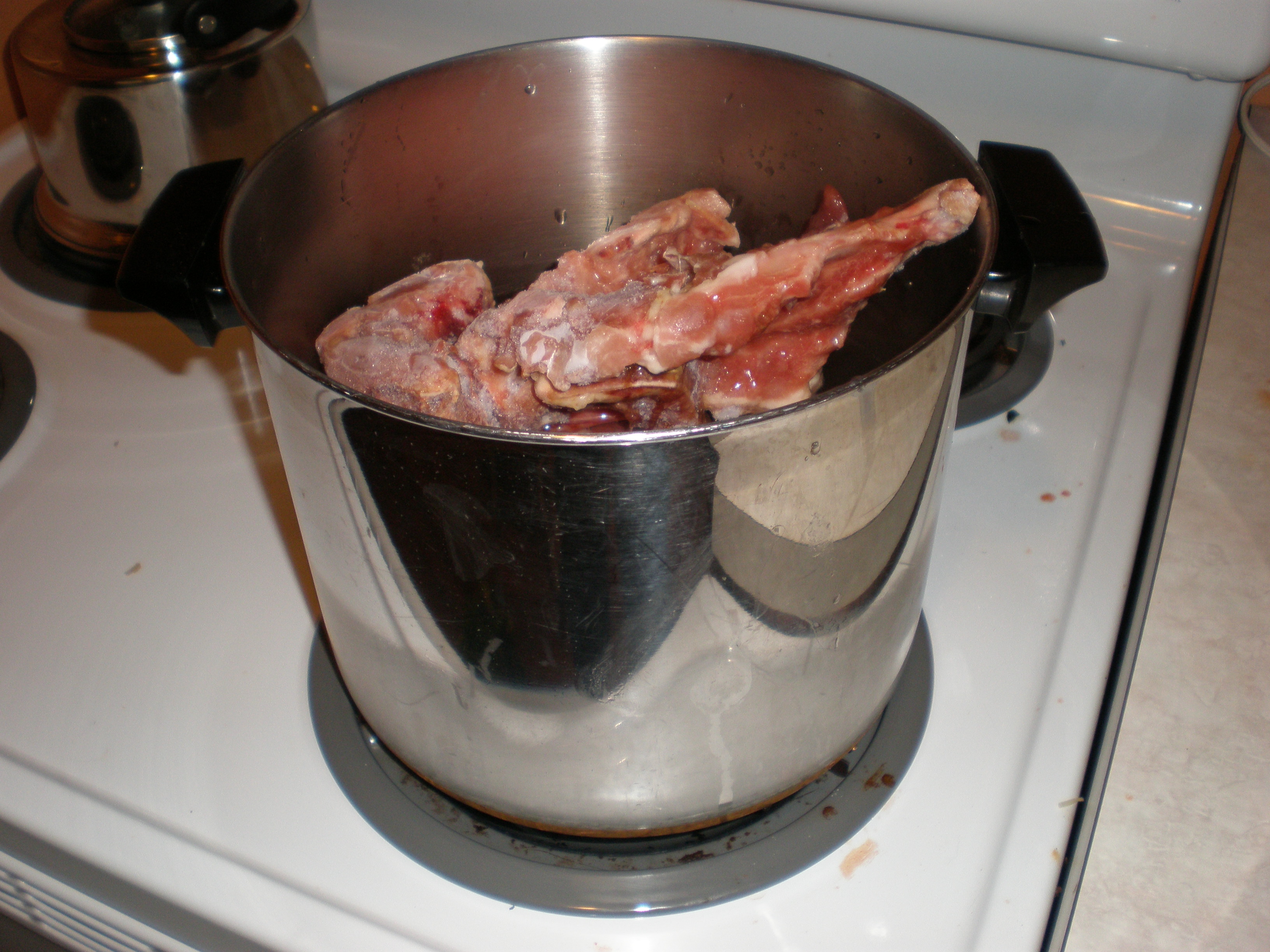 [you are probably wondering who keeps pork bones in the freezer . . . I was brought up with a “waste not, want not” mentality. The pork bones were from our 4th of July party — I made pulled pork and some of the pork butt had bones. I threw them in the freezer thinking that at some point boiling the hell out of them would make a nice broth and cook the bits of meat still attached.]