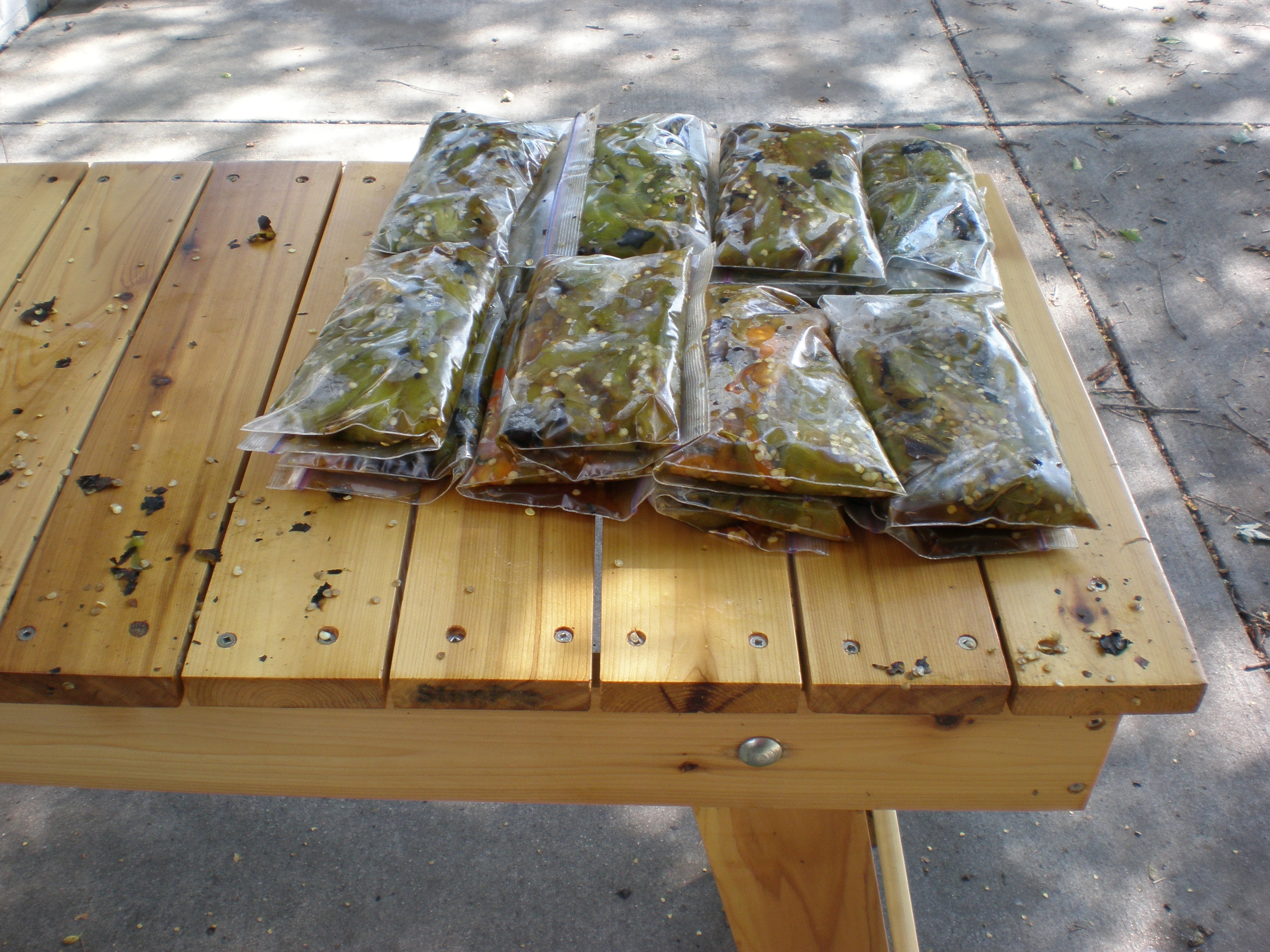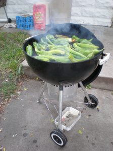 Yummmmmm . . . . can’t you just SMELL the chiles roasting? At this rate, the roasting took all afternoon. In New Mexico the vendors use big propane roasters that take care of the job quickly. But, once roasted, the chiles have to be refrigerated or frozen.