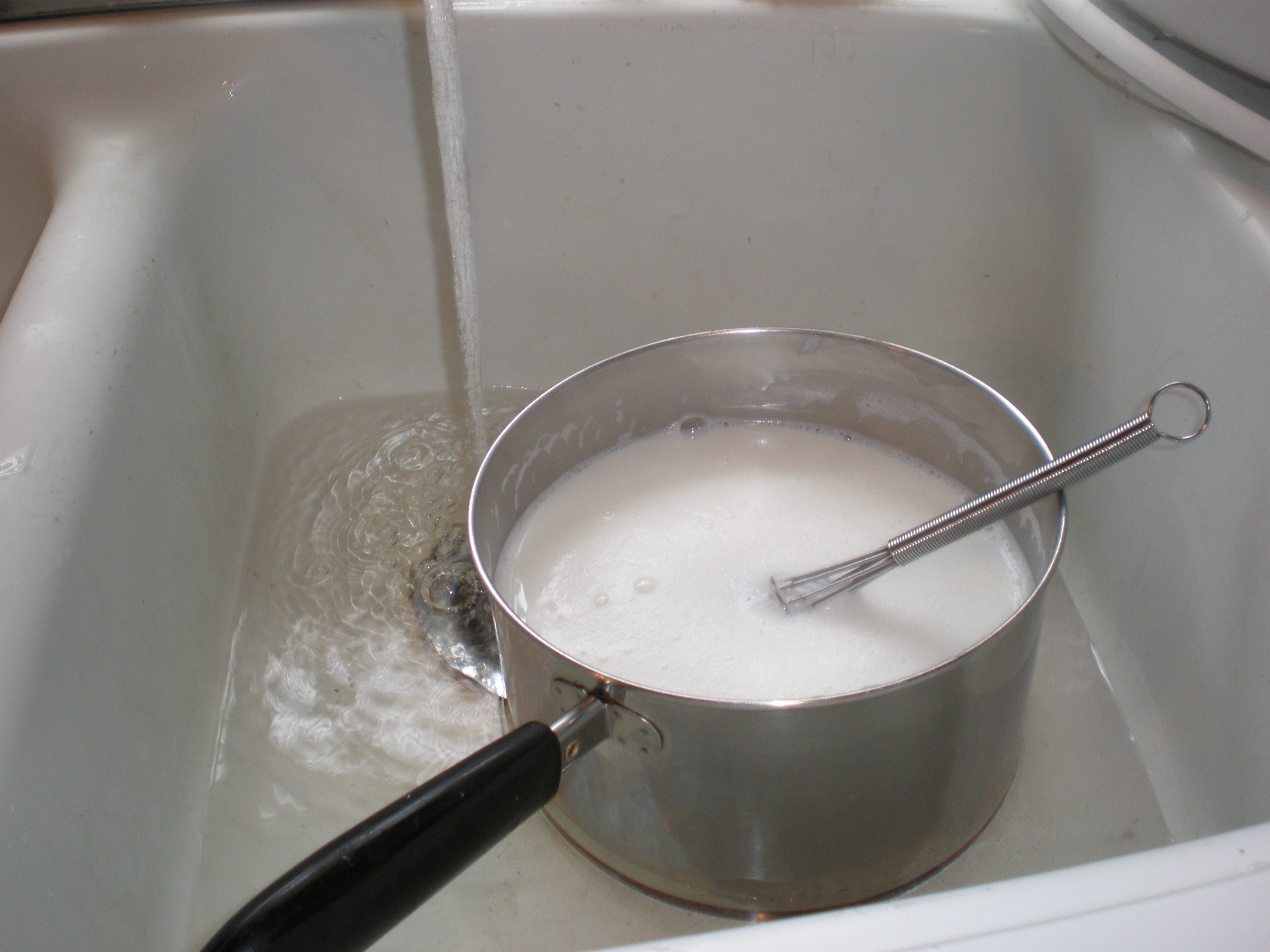 Cool the milk: Some people allow the milk to cool on its own. I’m too impatient, so I give the milk a cold water bath. Put the milk pot in the sink and fill it with cold water. Stirring the milk will help cool the milk faster. The milk needs to cool to 110 degrees. The milk can’t be too cold or too hot — otherwise the culture will either be killed (too hot) or not grow (too cold). BTW, I use the cold water for washing up afterward.