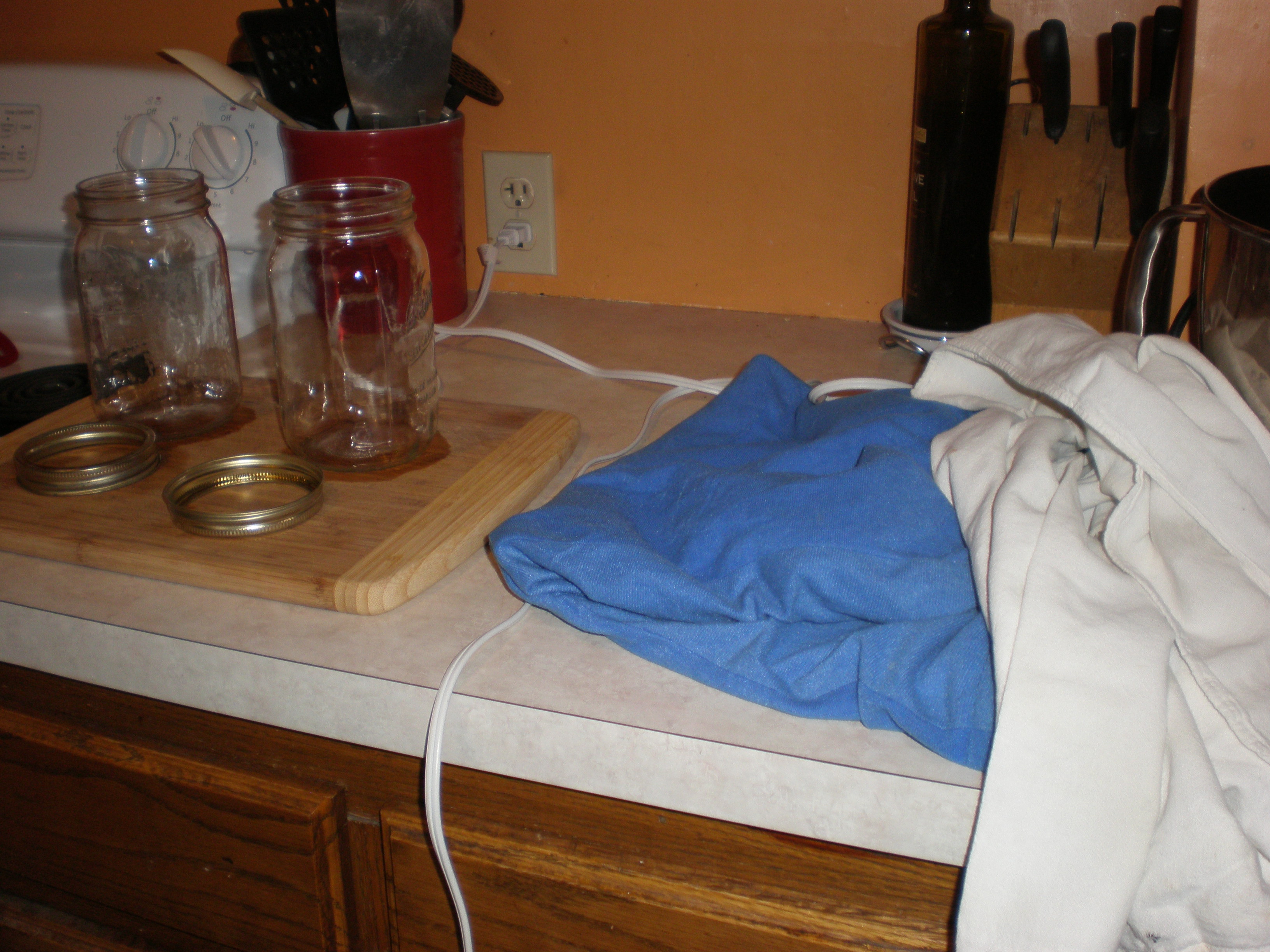 After placing the jars on the heating pad, invert the stock pot (emptied of contents and water) over the jars.