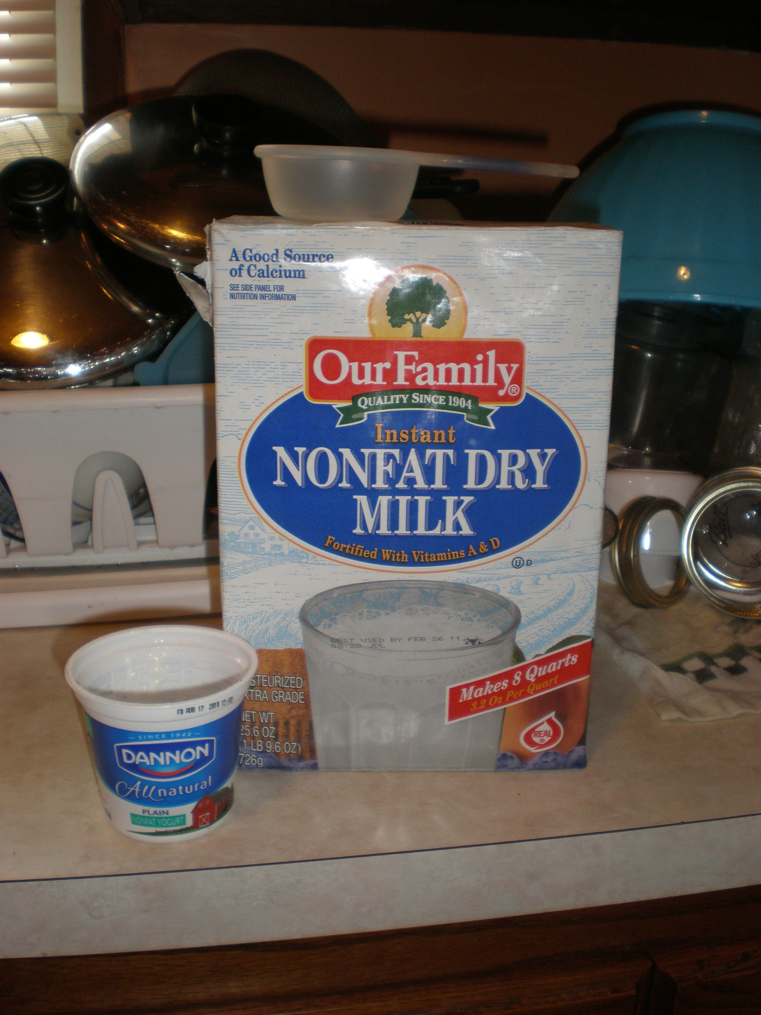 Powdered milk: this is actually great stuff to have on hand. I don’t care for drinking the stuff, but it comes in handy for cooking. This box of PM cost a little over $6.00. I reconstitute it for cooking since it is non-fat and cheap. For yogurt making, adding 1/3 cup of PM results in a thicker final product. It can be omitted.