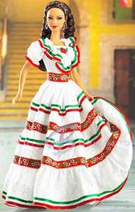 Hijole, who knew? “Aztec Barbie” was released in 2004 . . . I might have to get me one! Pero, check it out, she is totally guerrita! It looks like Mattel just dressed up Spanish Barbie in traje. After checking, I also found Cinco de Mayo Barbie . . .